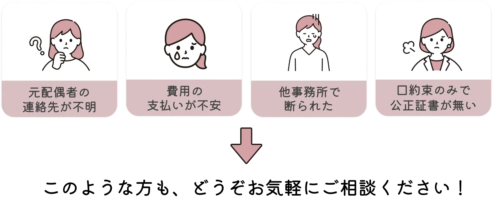 A.当事務所では、養育費の公正証書などの書面を作成しておらず、口約束のみの方にも対応可能です。公正証書がなく、他の事務所に相談を断られてしまった方も、ご相談ください。