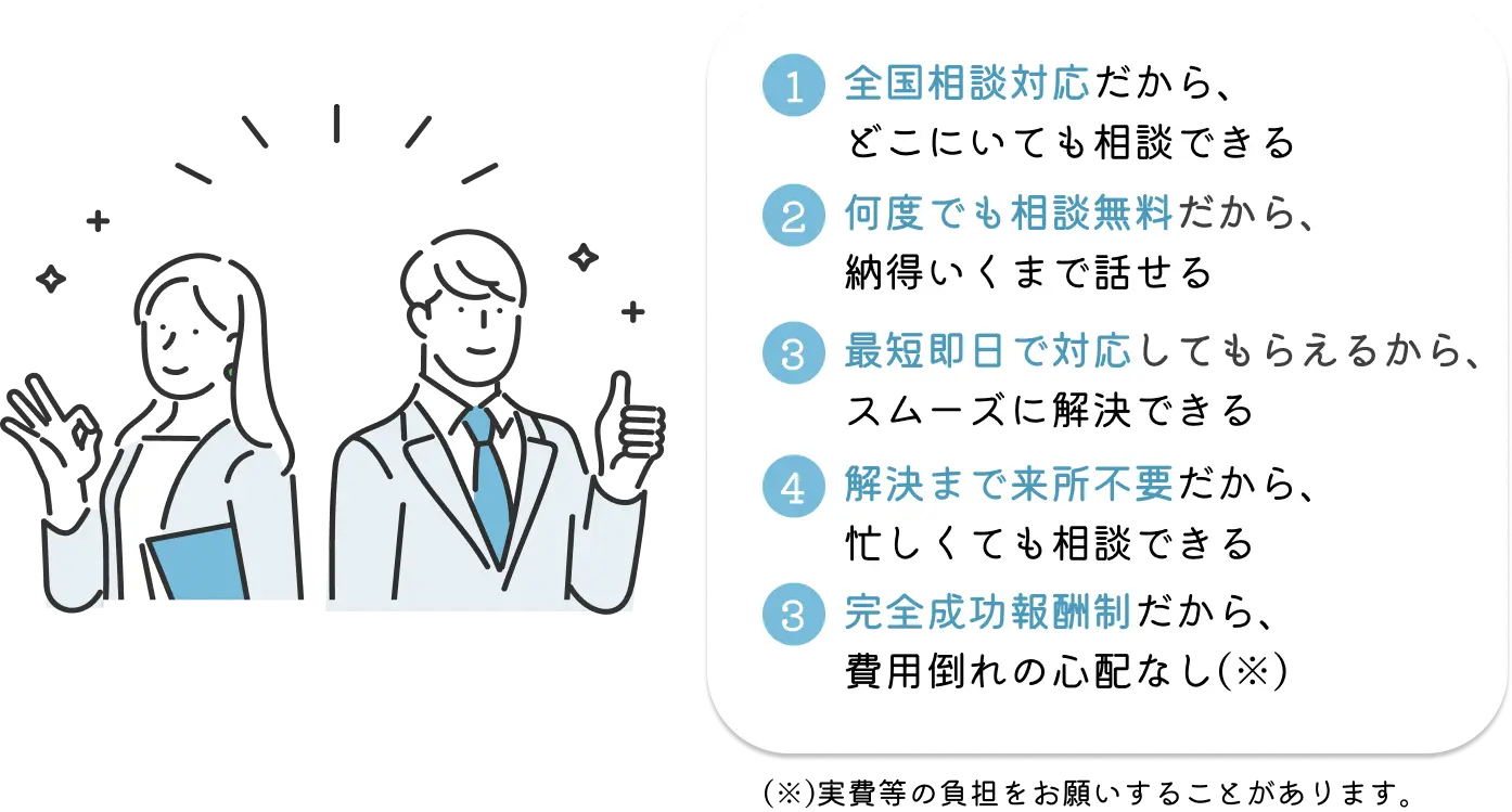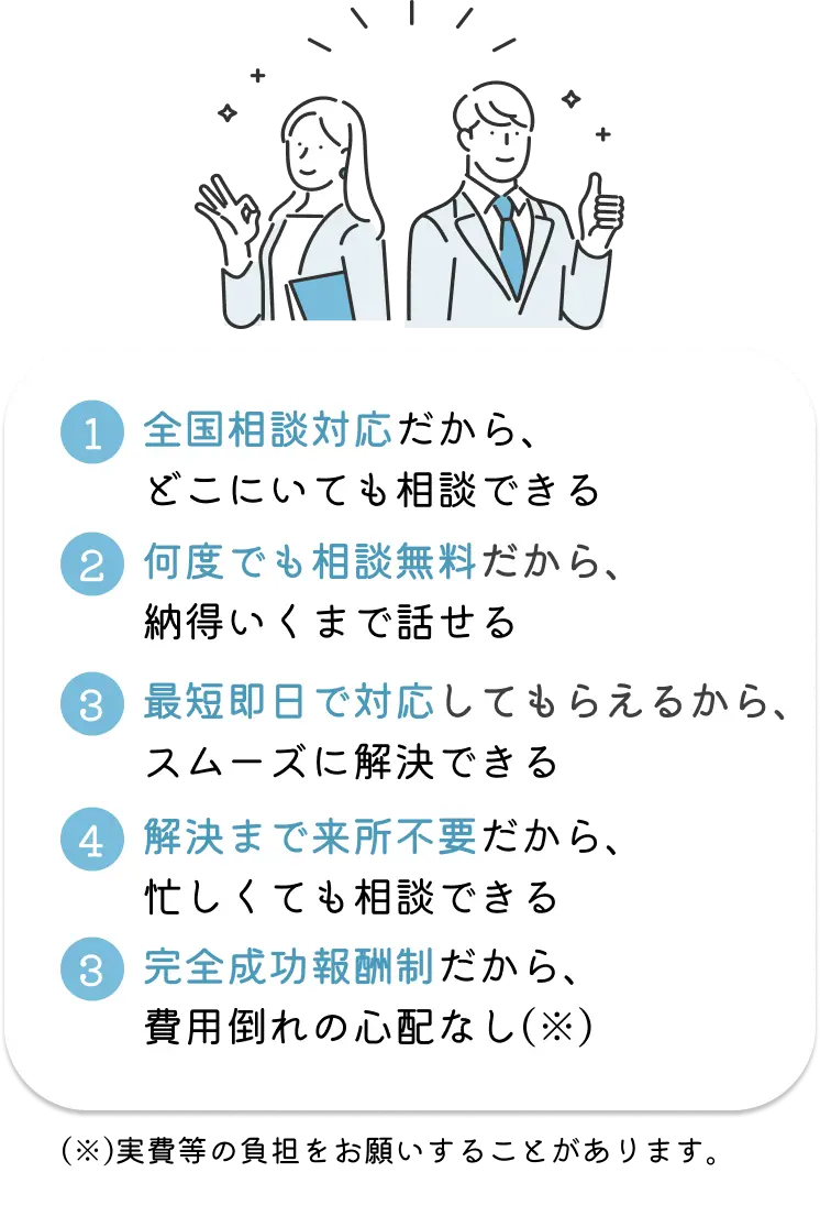 | 精神的なストレス | 相手と顔を合わせずに解決可能。現住所を知られないよう弁護士が最大限配慮。 |