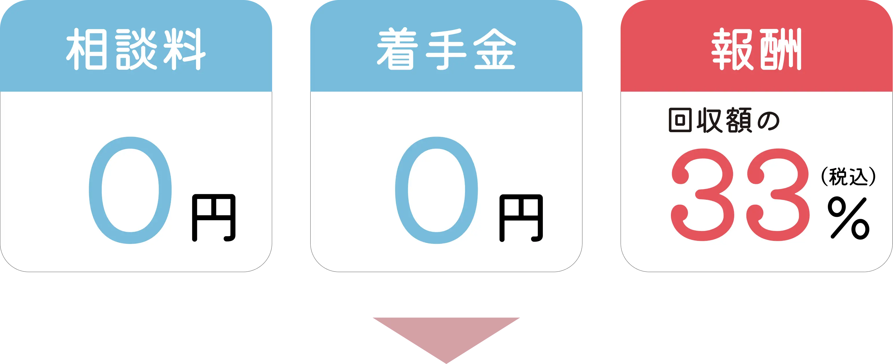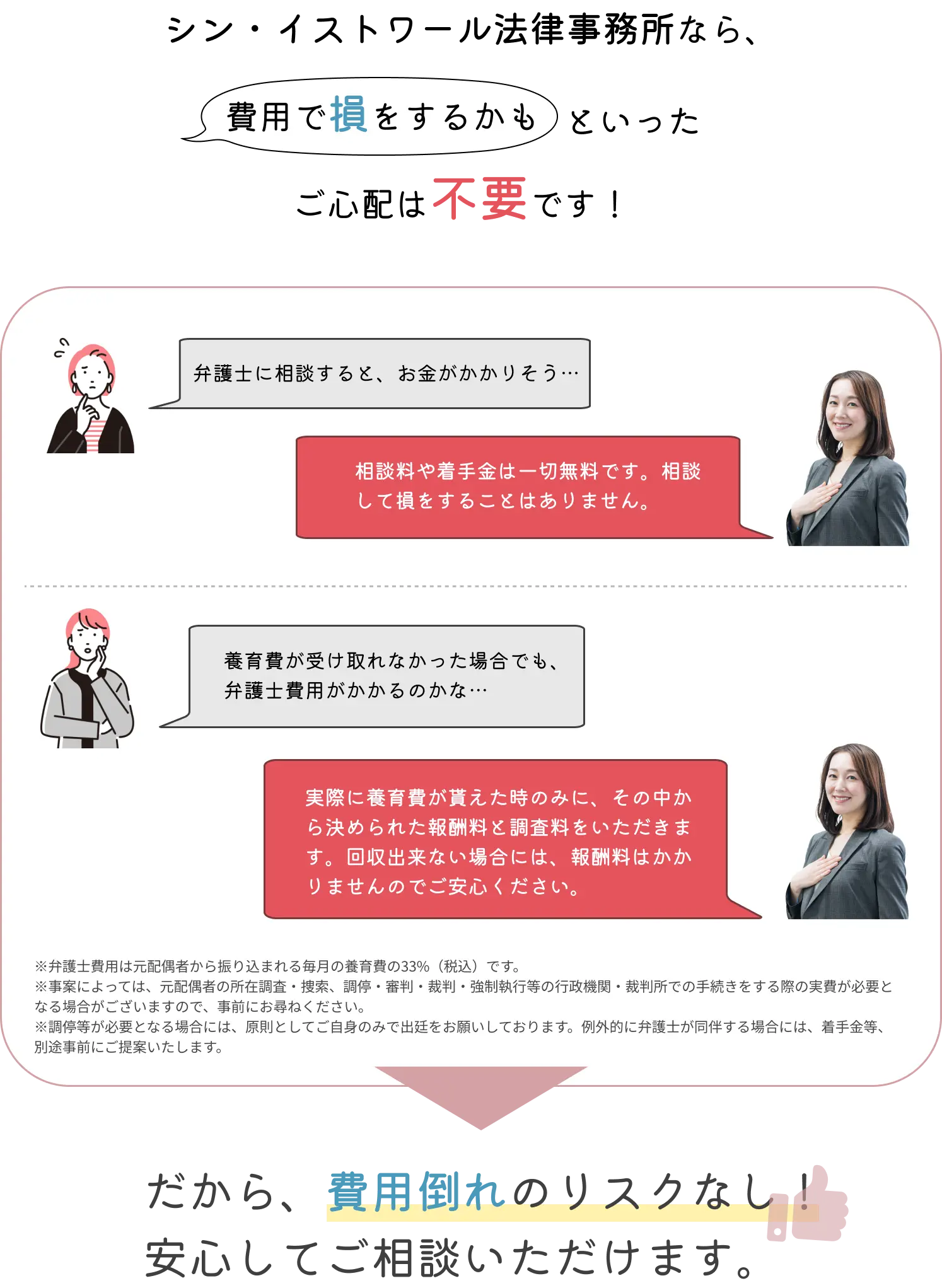 費用につきましては、元夫側から振り込まれる毎月の養育費の33%(税込)をお支払いいただくだけで結構です。